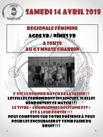 Je vous donne rendez-vous le samedi 14 avril 2018 à 20h30 au gymnase Charrin pour venir encourager notre équipe Régionale féminine qui jouera son dernier match de la saison !!