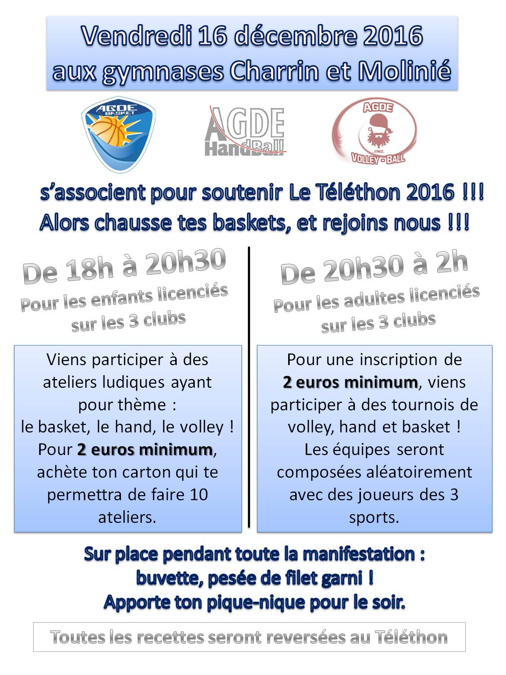 Le vendredi 16 décembre 2016, les clubs Agde Handball, Agde Basketball et Agde Volleyball s’associent pour le Téléthon 2016 !!!!